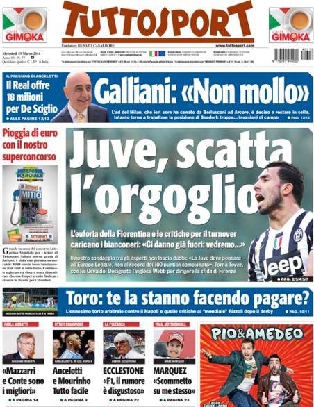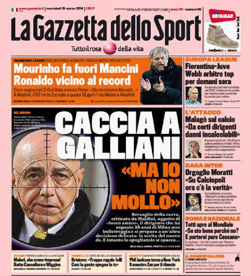 Rassegna stampa: caccia a Galliani. Opzione Spalletti. Offerta Real per De Sciglio – FOTO 19/03/2014 - 08:31 di Matteo B. Di seguito le prime pagine de La Gazzetta dello Sport, del Corriere dello Sport e di Tuttosport che danno ampio spazio alle vicende di casa Milan.