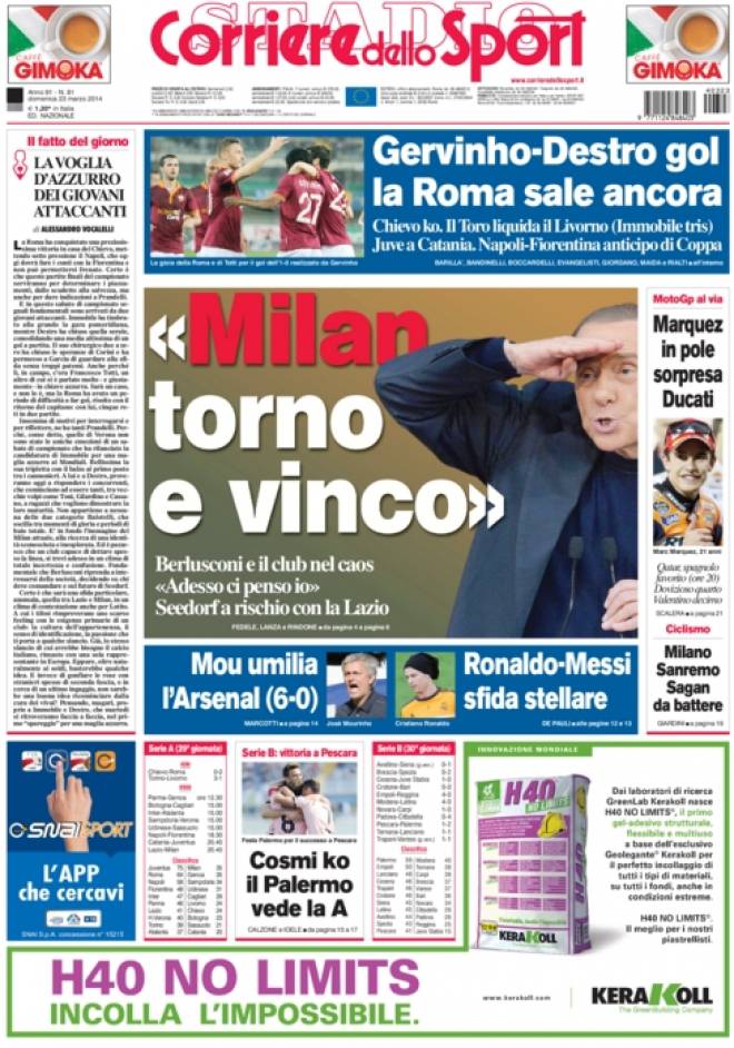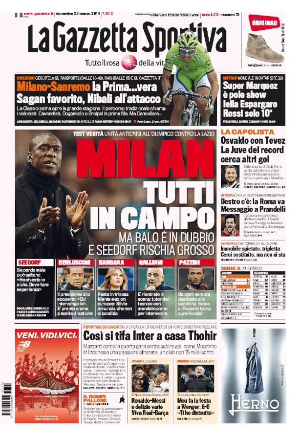 I titoli di Gazzetta, CorSport e Tuttosport: Milan tutti in campo, Seedorf rischia grosso – FOTO 23/03/2014 - 08:00 di Keivan Karimi Ecco le prime pagine dei tre maggiori quotidiani sportivi nazionali che danno risalto alla gara di oggi contro la Lazio e al momento poco sereno in casa Milan: