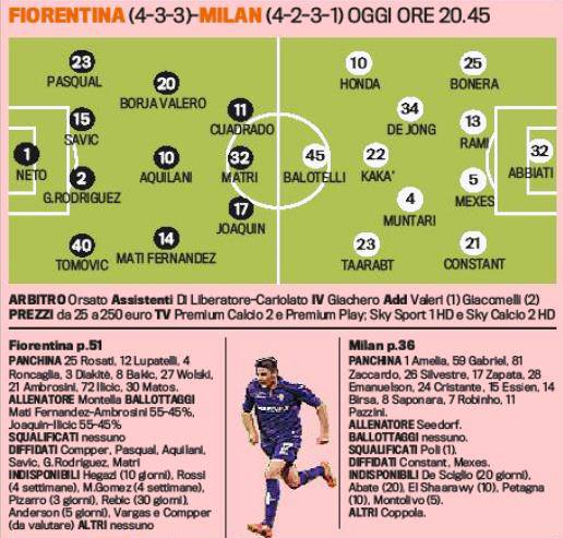 Questa sera il Milan va di scena al Franchi contro la Fiorentina di Vincenzo Montella. Clarence Seedorf dovrà fare a meno di giocatori importanti come gli infortunati Abate, De Sciglio, Montolivo, El Shaarawy e dello squalificato Poli. Torna Abbiati tra i pali. Sulle corsie laterali difensive dovrebbero agire Bonera e Constant. In mezzo al campo Muntari prenderà il posto di Essien, mentre in attacco verrà data una nuova chance ad Honda e verrà rilanciato Taarabt. Balotelli torna titolare.