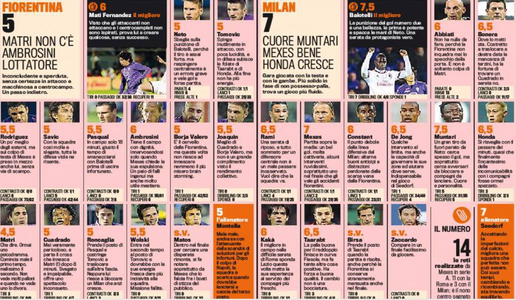 Di seguito proponiamo le pagelle redatte da La Gazzetta dello Sport per Fiorentina-Milan. Da segnalare che nella squadra rossonera non ci sono insufficienze. Mario Balotelli è stato designato come migliore in campo con 7.5, lo stesso voto assegnato a Sulley Muntari. Più che positive le prove di Mexes (7), Bonera (6.5), Rami (6.5), De Jong (6.5) e Taarabt (6.5).