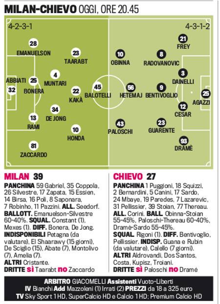 Milan-Chievo, le probabili formazioni: pochi cambi rispetto a Firenze 29/03/2014 - 09:20 di Keivan Karimi Ecco le probabili formazioni secondo la Gazzetta di Milan-Chievo, la gara che si giocherà stasera a San Siro come anticipo della 31.a giornata.