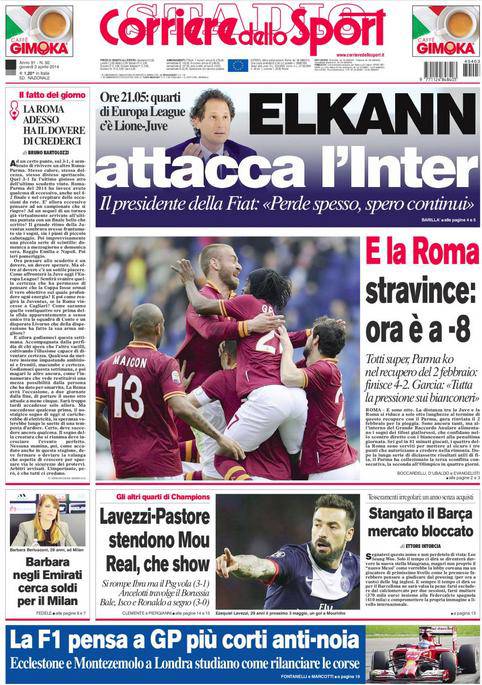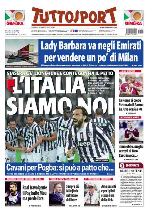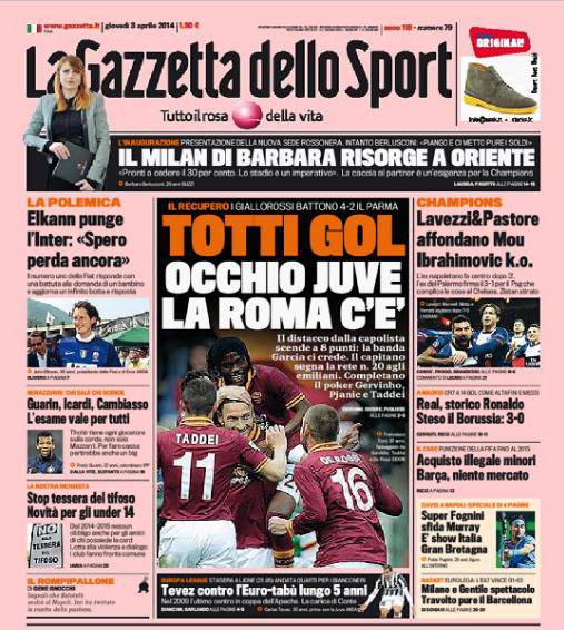 La Gazzetta dello Sport, il Corriere dello Sport e Tuttosport dedicano uno spazio importante al Milan nelle loro prime pagine. Nello specifico si parla del viaggio che dovrebbe compiere a breve Barbara Berlusconi in Oriente per cercare nuovi partner e nuovi soci per il club rossonero, soprattutto in ottica della costruzione di un nuovo stadio e per far tornare la squadra competitiva.