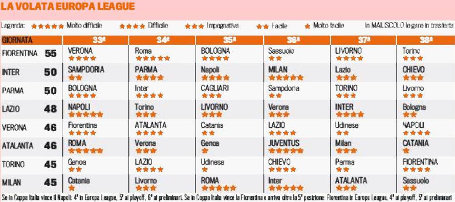 Di seguito riportiamo la grafica de La Gazzetta dello Sport inerente la volata all’Europa League che vede protagoniste ben 8 squadre. Ma se la Fiorentina sembra ormai quasi certa del 4° posto ed è finalista di Coppa Italia, per gli altri due posti a disposizione sarà vera battaglia tra Inter, Parma, Lazio, Verona, Atalanta, Torino e Milan.