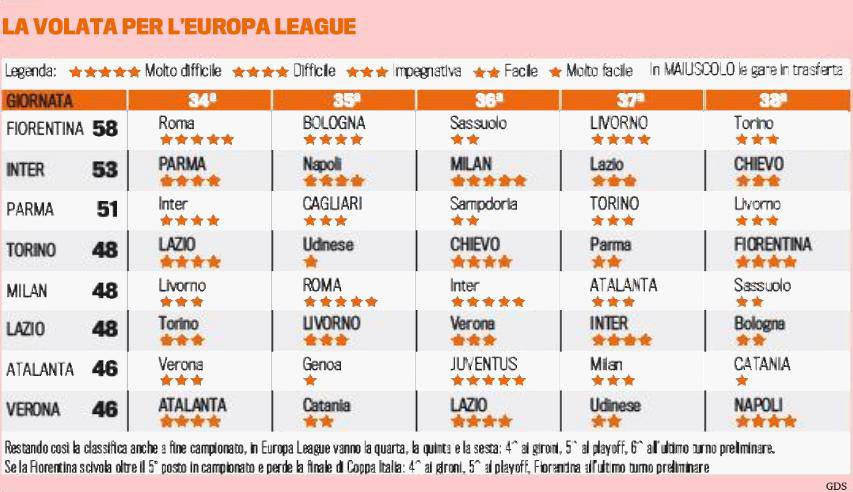 Ecco di seguito la grafica de La Gazzetta dello Sport con il calendario del Milan e delle altre pretendenti ad un posto in Europa League nelle ultime cinque giornate di campionato.