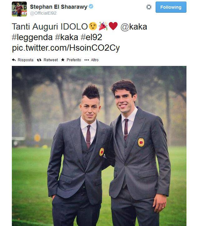 Gli auguri di El Shaarawy a Kakà su Twitter – FOTO 22/04/2014 - 21:38 di Matteo B. Stephan El Shaarawy ha fatto i propri auguri a Ricardo Kakà attraverso Twitter pubblicando una foto che ritrae i due giocatori del Milan assieme e scrivendo: “Tanti auguri idolo“.