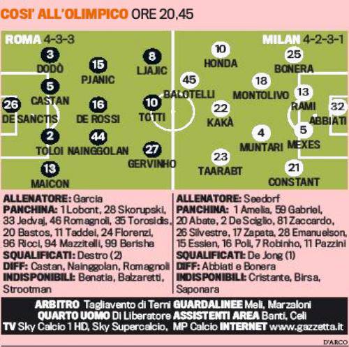 Ecco di seguito la grafica de La Gazzetta dello Sport con le probabili formazioni di Roma-Milan, partita che si giocherà questa sera allo Stadio Olimpico a partire dalle ore 20.45.