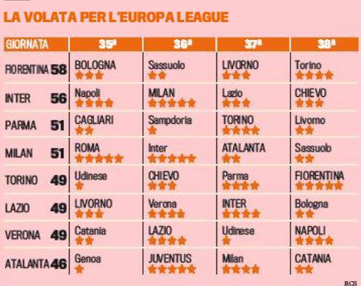 In queste ultime quattro giornate di campionato sarà interessante assistere alla volata Europa League che coinvolge ben otto squadre: Fiorentina, Inter, Parma, Milan, Torino, Lazio, Verona e Atalanta.
