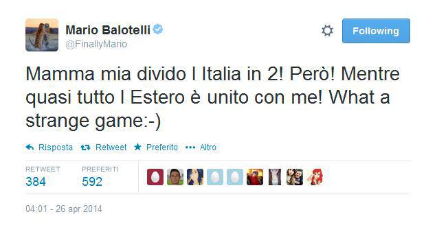 Balotelli su Twitter: “Divido l’Italia, ma all’estero sono con me” 26/04/2014 - 14:40 di Matteo B. Mario Balotelli dopo la lite avvenuta con alcuni opinionisti di Sky Sport nel post partita di Roma-Milan ha scritto il seguente messaggio su Twitter.