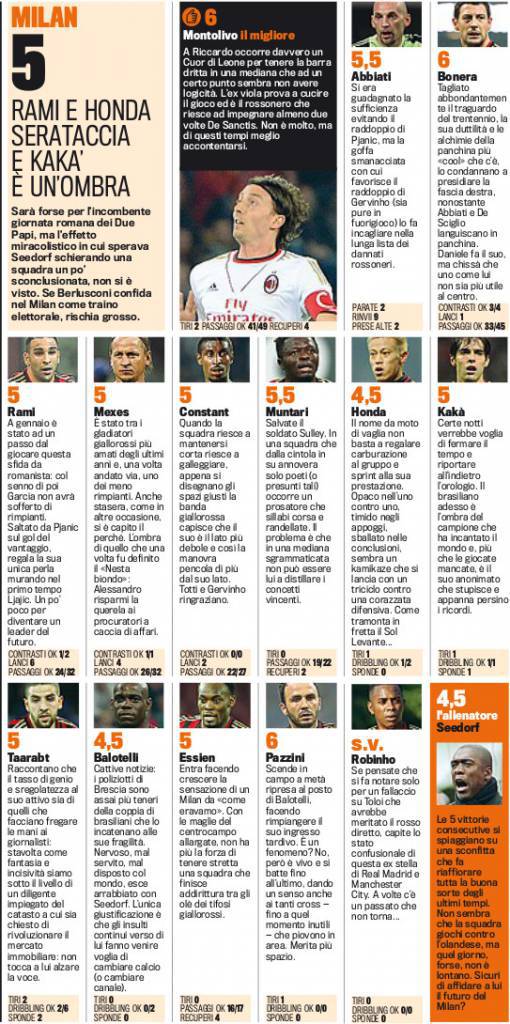 Roma-Milan, le pagelle dei rossoneri: serataccia per Rami, Kakà è un’ombra 26/04/2014 - 14:4626/04/2014 - 08:25 di Keivan Karimi Ecco come la Gazzetta di oggi valuta la prestazione di ieri sera all’Olimpico del Milan di Seedorf, sconfitto 2-0: