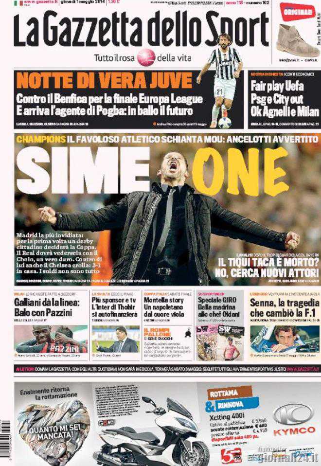 I titoli Gazzetta, CorSport e Tuttosport: Galliani dà la linea, Montolivo difende Balo – FOTO 01/05/2014 - 07:59 di Keivan Karimi Ecco di seguito la rassegna stampa odierna con le prime pagine de La Gazzetta dello Sport, Corriere dello Sport e Tuttosport.