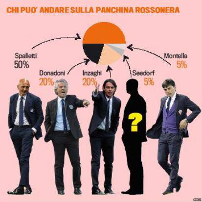 La Gazzetta dello Sport riporta che Luciano Spalletti sarebbe in pole position per sostituire Clarence Seedorf sulla panchina del Milan con una percentuale del 50%. Al secondo posto con il 20% ciascuno troviamo Filippo Inzaghi e Roberto Donadoni. Per l’attuale tecnico rossonero e per Vincenzo Montella rimane da spartirsi equamente il 10% rimasto.