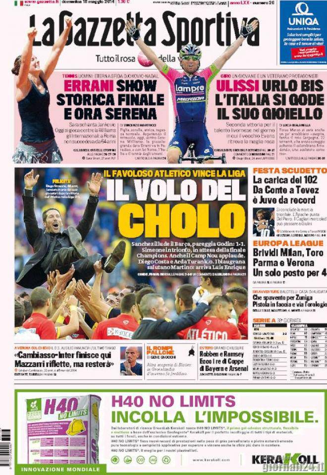 Gazzetta dello Sport, i titoli del 18 maggio 18/05/2014 - 08:08 di Keivan Karimi I titoli e la prima pagina della Gazzetta dello Sport di oggi, con un occhio alle notizie di casa Milan: Via agli ultimi fuochi: il Milan per l’Europa Clarence e i cronisti: guerra e pace Non basta vincere, ci vuole il Toro ko e il pari di Donadoni Gazzetta dello Sport 18-5