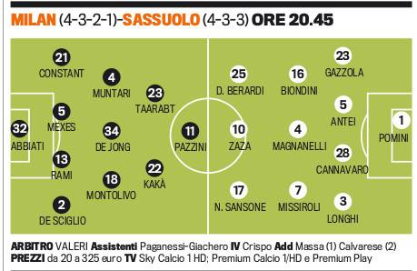 Milan-Sassuolo, le probabili formazioni: Pazzini titolare, Mastour in panchina 18/05/2014 - 09:5918/05/2014 - 08:40 di Keivan Karimi Ecco le probabili formazioni di Milan-Sassuolo, gara di oggi che chiude la stagione rossonera, secondo la Gazzetta dello Sport: Milan-Sassuolo, le formazioni