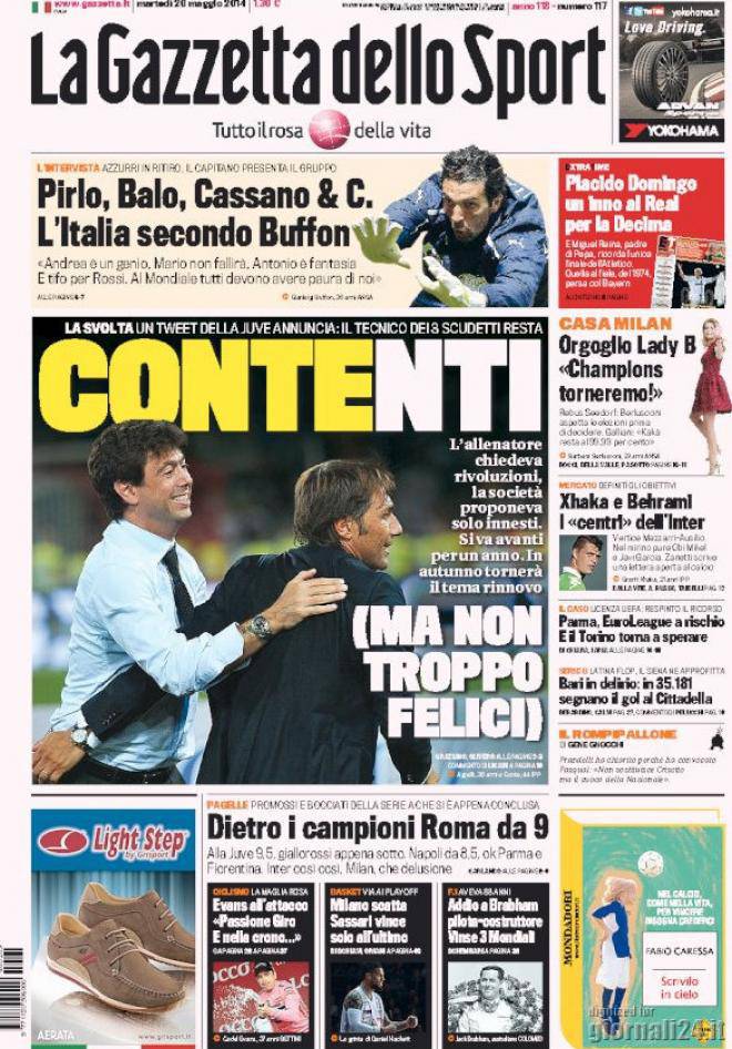 Gazzetta dello Sport, i titoli del 20 maggio 20/05/2014 - 08:07 di Keivan Karimi Ecco prima pagina e principali titoli riguardanti il Milan secondo l’edizione odierna della Gazzetta dello Sport: Orgoglio Lady B: torneremo in Champions Rebus Seedorf-Berlusconi Kakà resta al 99,99% Gazzetta dello Sport
