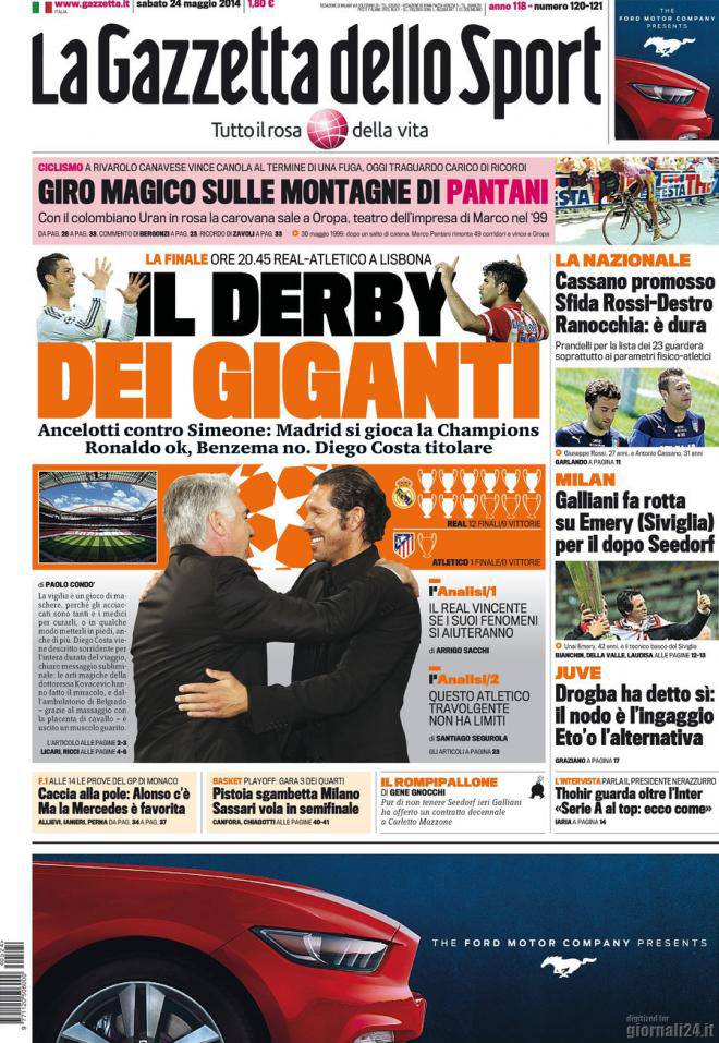 Gazzetta dello Sport, titoli e prima pagina del 24 maggio 27/05/2014 - 11:5724/05/2014 - 09:29 di Keivan Karimi Ecco la prima pagina e i titoli della ‘rosea’ di oggi, soprattutto per quanto riguarda le cronache rossonere: