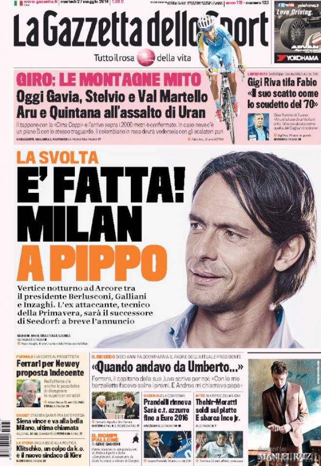 Gazzetta dello Sport, prima pagina e titoli del 27 maggio 27/05/2014 - 11:5327/05/2014 - 08:10 di Keivan Karimi Ecco come apre oggi la Gazzetta dello Sport, con le notizie inerenti a casa Milan: Berlusconi vota Inzaghi Giro d’Europa con in testa Pippo Tutti gli allenatori del presidente Gasport