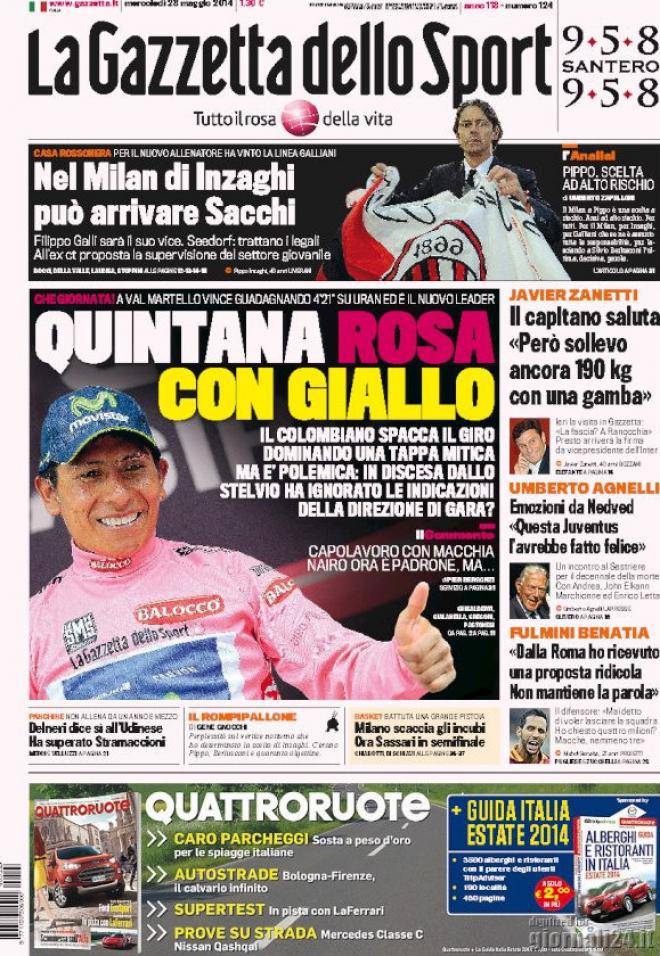 Gazzetta dello Sport, prima pagina e titoli del 28 maggio 28/05/2014 - 08:12 di Keivan Karimi Ecco come apre l’edizione odierna della Gazzetta dello Sport, con i titoli inerenti alle cronache di casa Milan: Con Inzaghi vince la linea Galliani Milan, rispunta Sacchi Galli sarà il secondo, nodo Tassotti