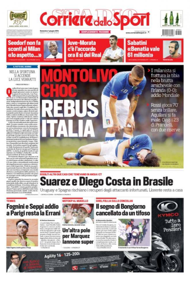 Corriere dello Sport, prima pagina e titoli del 1 giugno 01/06/2014 - 08:57 di Keivan Karimi Ecco come apre oggi il Corriere dello Sport: Montolivo addio Mondiale Seedorf zero sconti Squadra nel segno del made in Italy