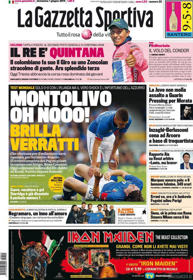 Gazzetta dello Sport, prima pagina e titoli del 1 giugno 01/06/2014 - 08:53 di Keivan Karimi Ecco come apre oggi la Gazzetta dello Sport: Ahi Montolivo, 3-4 mesi out Milan, fantasia a cena Seedorf, silenzio e amarezza