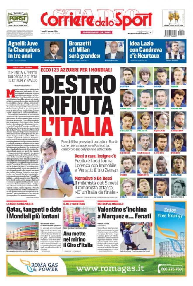 Corriere dello Sport, prima pagina e titoli del 2 giugno 02/06/2014 - 08:08 di Keivan Karimi Ecco come apre il Corriere dello Sport di oggi, con un occhio alle cronache rossonere: Montolivo si opera a Milano Bronzetti: grande Milan con la triade Kakù punto fermo, riscatto per Rami