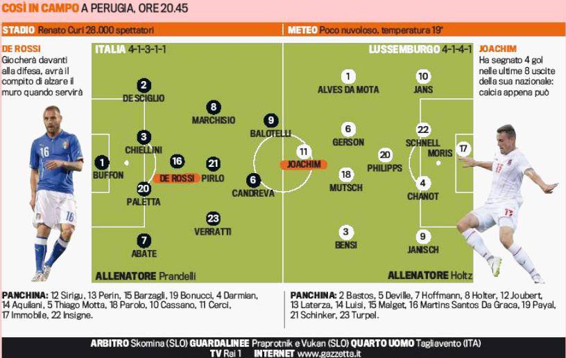 Di seguito la grafica de La Gazzetta dello Sport con gli probabili schieramenti delle due nazionali.