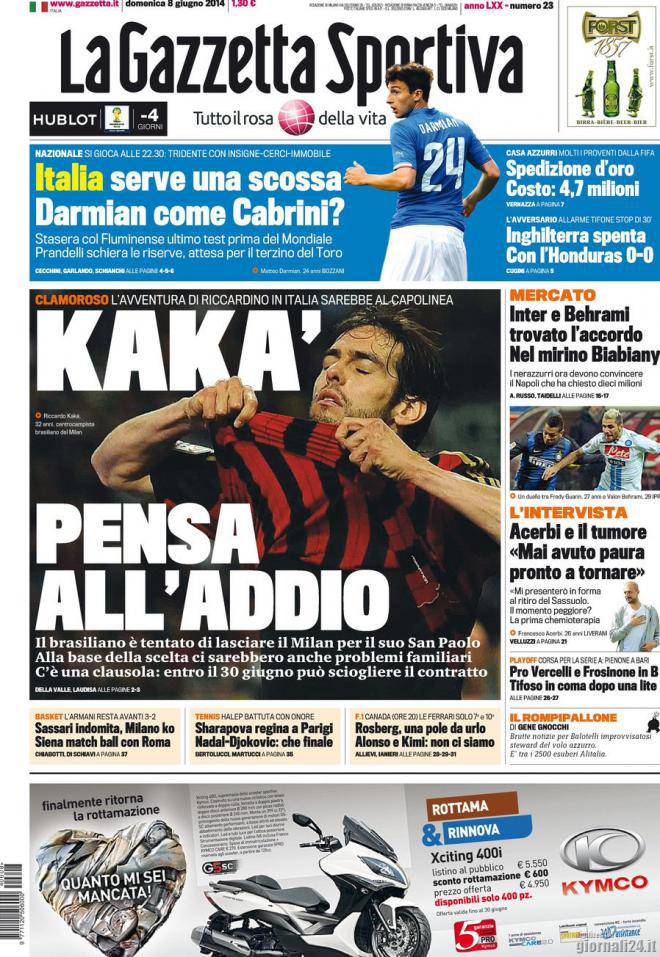 Gazzetta dello Sport, prima pagina e titoli del 8 giugno 08/06/2014 - 09:09 di Keivan Karimi Ecco come apre oggi l’edizione della Gazzetta: Kakà pensa all’addio Inzaghi vuole il mago delle palle inattive Acerbi: Mai pensato di arrendermi