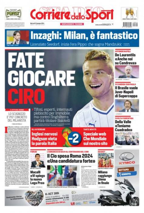 Corriere dello Sport, prima pagina e titoli del 10 giugno 10/06/2014 - 08:10 di Keivan Karimi Ecco come apre l’edizione odierna del CorSport: Seedorf addio, tocca a Inzaghi Kakà già con Miss Brasile Mandzukic saluta il Bayern