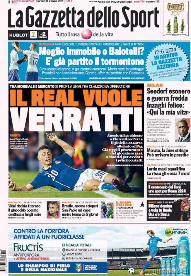 Gazzetta dello Sport, prima pagina e titoli del 10 giugno 10/06/2014 - 08:07 di Keivan Karimi Ecco come apre l’edizione odierna della Gazzetta: Seedorf, esonero e guerra fredda Inzaghi felice: Qui la mia vita Rami ore decisive