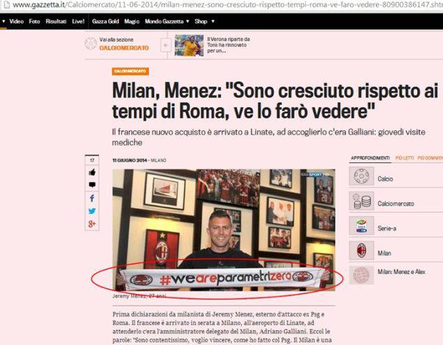 La Gazzetta dello Sport, il quotidiano sportivo più letto d’Italia, ha commesso una simpatica gaffe dopo lo sbarco a Milano di Jeremy Menez. Nella sua versione online ha pubblicato una foto che ritrae il nuovo giocatore del Milan nel ristorante Giannino con una sciarpa che recita “#weareparametrizero” al posto della scritta con l’hasthag ordinario “#weareacmilan”. Si trattava effettivamente di un fotomontaggio creato ad arte da qualcuno ed erroneamente ripreso dalla Gazzetta. Successivamente questa immagine è stata rimossa, ma la riportiamo di seguito.