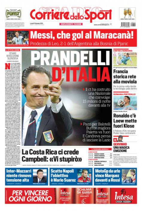 Corriere dello Sport, prima pagina e titoli del 16 giugno 16/06/2014 - 08:22 di Keivan Karimi Ecco l’apertura odierna del quotidiano sportivo nazionale: Un vice-Montolivo per Inzaghi Contratto per Mastour