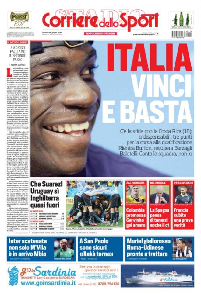 Corriere dello Sport, prima pagina e titoli del 20 giugno 20/06/2014 - 08:11 di Keivan Karimi Ecco come apre oggi l’edizione del quotidiano nazionale: Balotelli: “Conta la squadra, non io” Kakà, il San Paolo lo chiama Il Milan respira