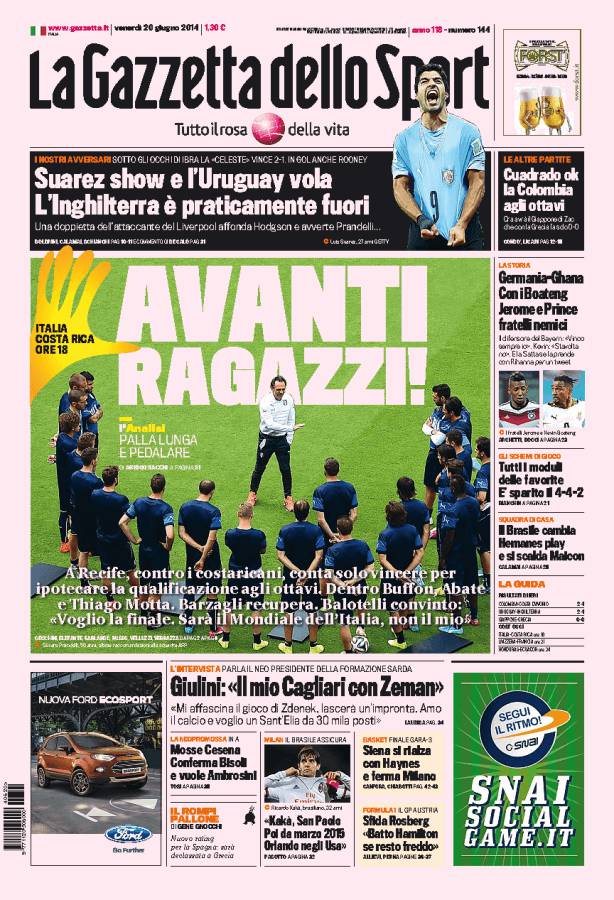 Gazzetta dello Sport, prima pagina e titoli del 20 giugno 20/06/2014 - 08:07 di Keivan Karimi Ecco come apre oggi l’edizione del quotidiano nazionale: Balotelli non si sbilancia Allievi: l’Inter batte il Milan Kakà-Milan, ecco l’addio