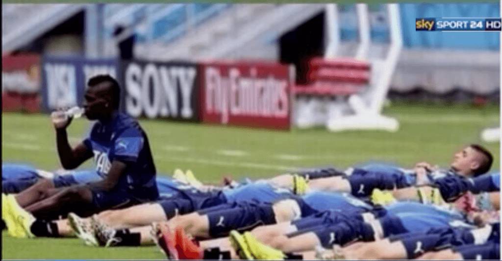 Nell’allenamento della Nazionale italiana, hanno fatto il giro del mondo una serie di immagini in cui Balotelli si “allena” meno dei compagni. Ecco la foto ripresa da Sky Sport 24: