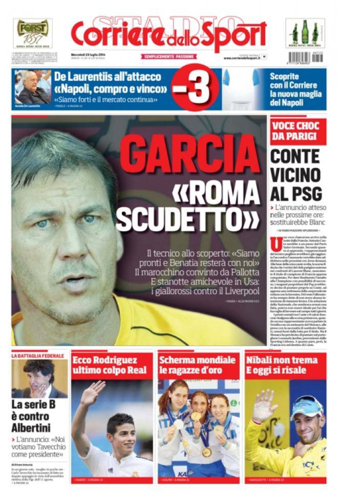 Corriere dello Sport, prima pagina e titoli del 23 luglio 23/07/2014 - 08:19 di Keivan Karimi Eccovi come il CorSport di oggi apre la sua edizione: Legge Inzaghi: Balotelli zero alibi Domani al via contro l’Olympiacos Blitz per Douglas Costa