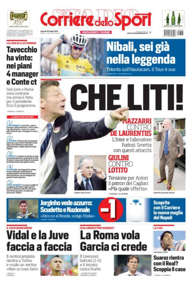 Corriere dello Sport, prima pagina e titoli del 25 luglio 25/07/2014 - 08:16 di Keivan Karimi Ecco l’apertura del quotidiano sportivo odierno: Milan, sale Campbell scende Costa Con il Liverpool Menez con Balotelli Robinho che caos