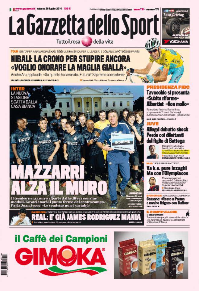 Gazzetta dello Sport, prima pagina e titoli del 26 luglio