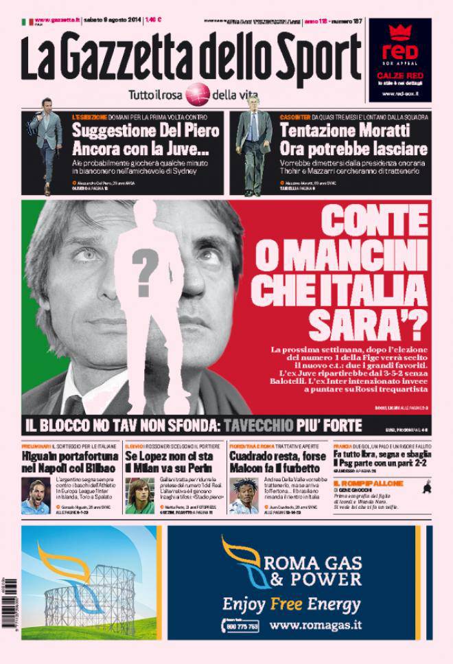 Gazzetta dello Sport, prima pagina e titoli del 9 agosto 09/08/2014 - 08:10 di Keivan Karimi Eccovi l’apertura odierna della Gazzetta: Bivio Milan, o Lopez o Perin Inzaghi: Quante bugie su Balo Armero è rossonero