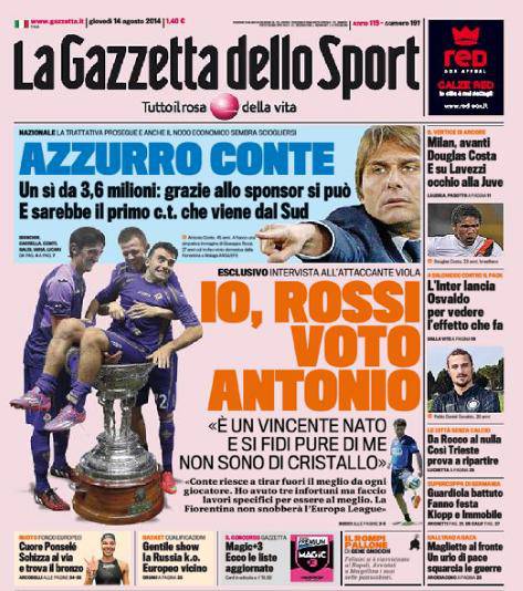 Gazzetta dello Sport: la prima pagina del 14 agosto 14/08/2014 - 08:31 di Matteo B. Gazzetta dello Sport 13-08-2014 Redazione Milanlive.it