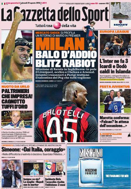 Gazzetta dello Sport: la prima pagina del 21 agosto 21/08/2014 - 08:05 di Matteo B. La Gazzetta dello Sport 21-08-2014 Redazione Milanlive.it
