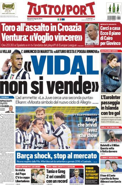 Tuttosport: la prima pagina del 21 agosto 2014 21/08/2014 - 08:09 di Matteo B. Tuttosport 21-08-2014 Redazione Milanlive.it