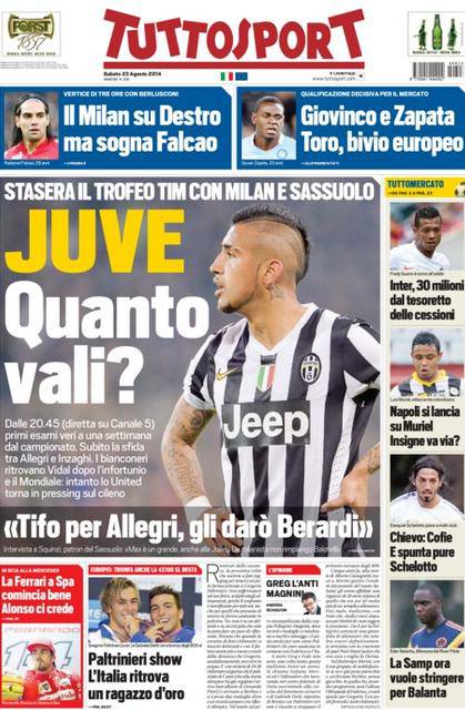Tuttosport: la prima pagina del 23 agosto 23/08/2014 - 08:22 di Matteo B. Tuttosport 23-08-2014 Redazione Milanlive.it