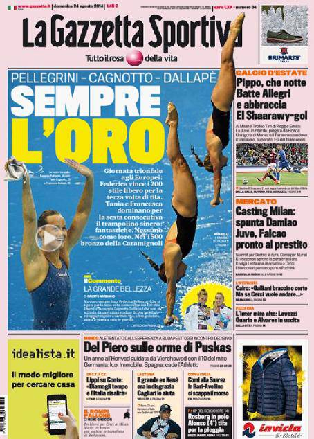 Gazzetta dello Sport: la prima pagina del 24 agosto 24/08/2014 - 08:20 di Matteo B. La Gazzetta dello Sport 24-08-2014 Redazione Milanlive.it