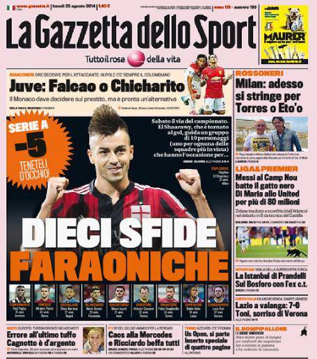 Gazzetta dello Sport: la prima pagina del 25 agosto 25/08/2014 - 08:03 di Matteo B. La Gazzetta dello Sport 25-08-2014 Redazione Milanlive.it