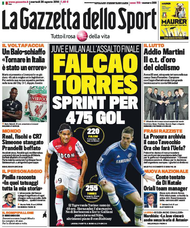 [caption id="attachment_101806" align="alignnone" width="475"] La Gazzetta dello Sport 26-08-2014[/caption] Redazione Milanlive.it
