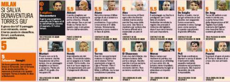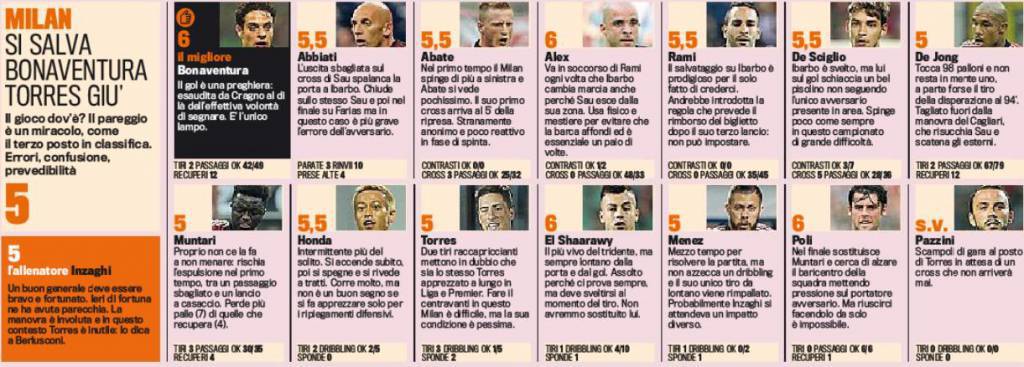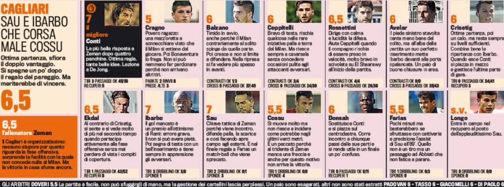 La Gazzetta dello Sport ha stilato le pagelle di Cagliari-Milan. Nei sardi il migliore in campo è stato Conti, che assieme a Ibarbo e Sau si è meritato il 7. Appena sotto la sufficienza solo Cossu e Farias. Nei rossoneri sufficienti solamente Bonavetura (il migliore dei rossoneri), Alex, Poli ed El Shaarawy. Da 5 invece le prove di De Jong, Muntari, Torres e Menez. Ecco di seguito le grafiche con le pagelle complete.