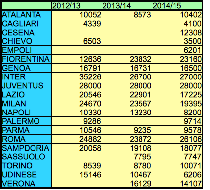 Il bilancio della serie A è influenzato soprattutto dai crolli di Milan (19.333 abbonati), Napoli (8.200 abbonati circa) e Lazio (17.133 abbonati), dovuti alla delusione delle rispettive tifoserie per una campagna acquisti non all’altezza delle aspirazioni e nel caso del club di Aurelio De Laurentiis per il mancato accesso alla Champions league. I tre team hanno subito una perdita complessiva di quasi 14mila abbonamenti rispetto a un anno fa.