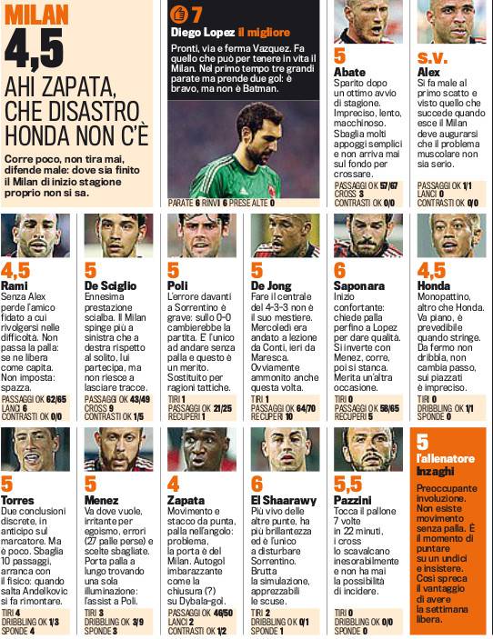 Milan-Palermo è finita 0-2 per la squadra ospite, in una serata terribile per gli uomini di Inzaghi incapaci di comandare il gioco e di tenere a bada la squadra siciliana, molto più mobile e attiva. La Gazzetta dello Sport ha assegnato le pagelle ai calciatori milanisti scesi in campo ieri, con molte bocciature e qualche promozione per inerzia.