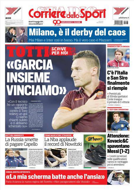 Corriere dello Sport: la prima pagina del 13 novembre 13/11/2014 - 08:10 di Matteo B. Redazione MilanLive.it