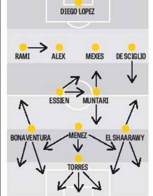 Davanti alla difesa ci sarà una diga made in Ghana con Muntari ed Essien che avranno il compito di arginare Kovacic e Guarin. Gli esterni offensivi Bonaventura ed El Shaarawy dovranno essere bravi a coprire la fascia sia in fase offensiva che difensiva. Menez agirà alle spalle di Torres in un ruolo che gradisce molto ed avrà la libertà di svariare attaccando lo spazio che gli verrà concesso e creando superiorità numerica. Il centravanti spagnolo dovrà tenere impegnati i centrali dell’Inter e saper tenere palla per far salire la squadra.