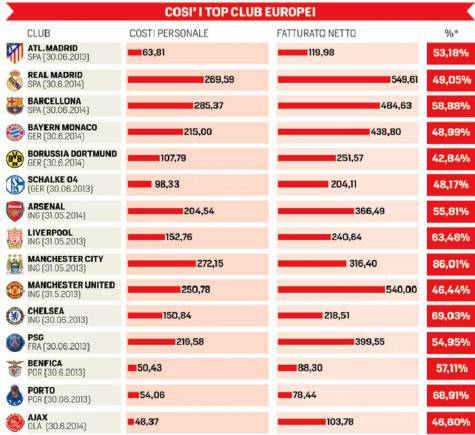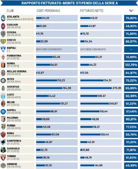 Marcello Vulpis per il Corriere dello Sport ha fatto un’indagine confrontando i costi del personale ed i fatturato dei club della Serie A. Risulta che ben 11 società su 20 non rispettano i parametri del Fair Play Finanziario voluto dall’Uefa. Il rapporto tra le due voci non deve superare il 70%. Da anni si parla di contenimento delle spese, visto che secondo il principio generale stabilito non dovrebbero superare i ricavi, ma nei fatti possiamo notare che i bilanci sono tutt’altro che a posto.